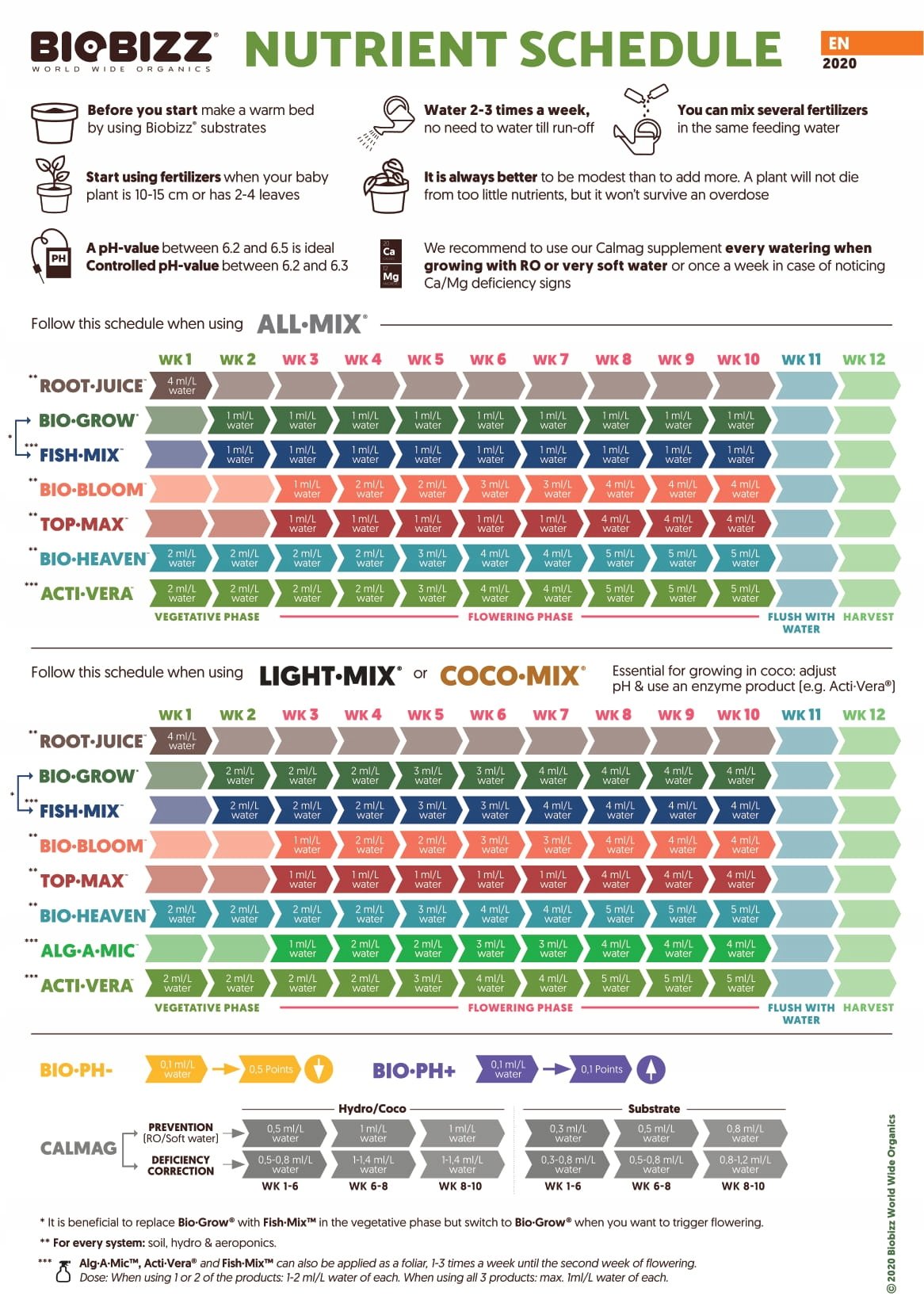 Ja używam całego zestawu od BioBizz łącznie z gleba. Na Veg LightMix a na flo AllMix. Ciezko je przedawkowac, moze śmiało dawać pelne dawki z tabeli. Osobiście praktycznie nie używam BioGrow. Na Vegu tylko CalMag i teraz po 5 tygodniach życia roślin BioHeven. Daje kopa już po 2 dniach od podlania. Jak nie mierzysz EC to nawozów nie dawaj za każdym razem. Np 1-2 podlania woda i za kolejnym razem pełna dawkę z tabeli. Ja tak robiłem i niedoborow nie było.